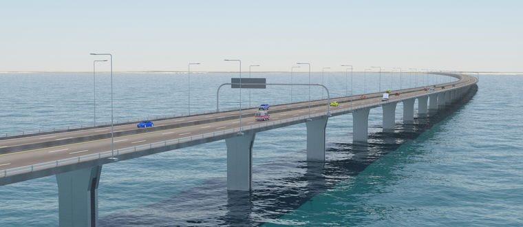 Το έργο αφορά σε προμελέτη για διαγωνισμό και ανατέθηκε στην ΚΑΛΛΙΕΡΓΟΣ Α.Ε. από την ARCHIRODON. Για τον ακριβή προσδιορισμό των ποσοτήτων του έργου διεξείχθησαν υπολογισμοί και σχέδια σε προχωρημένο επίπεδο για όλες τις κατασκευές οι οποίες περιλαμβάνουν: • Γέφυρα διπλού κλάδου συνολικού μήκους περίπου 7 Χλμ. εντός της θάλασσας. Η γέφυρα αποτελείται από 123 ανοίγματα με μεσόβαθρα επί χαλύβδινων πασσάλων. Ο φορέας της γέφυρας αποτελείται από προκατασκευασμένους προεντεταμένους σπονδύλους. • Τρείς γέφυρες ανισόπεδων κόμβων με αντίστοιχα έργα προσβάσεων (τοίχοι αντιστήριξης). • Μία σύμμικτη γέφυρα ενός ανοίγματος 74m πάνω από υφιστάμενους αγωγούς.